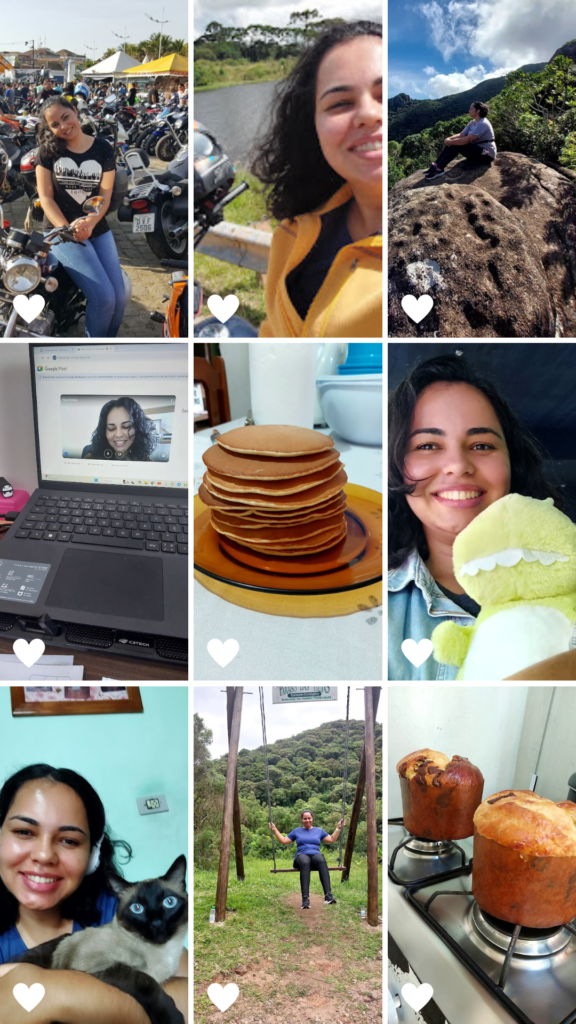 Amo séries e cinema, tenho um gato lindo, amo a natureza, adoro sair por aí com a minha moto, amo meu trabalho, amo minha família e amigos, amoooo cozinhar, treinar e amo estar cada vez mais conhecendo a mim mesma! (Muito bom poder amar muitas coisas).